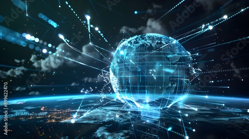 © waqas, Obraz premium A high-tech digital representation of a global network, featuring a glowing blue sphere with interconnected lines and nodes, symbolizing a virtual world connected by data and communication technologie