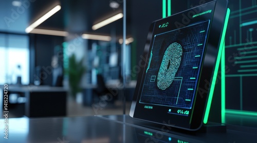 Obraz premium A high-tech fingerprint scanner showcases biometric data in a sleek office....