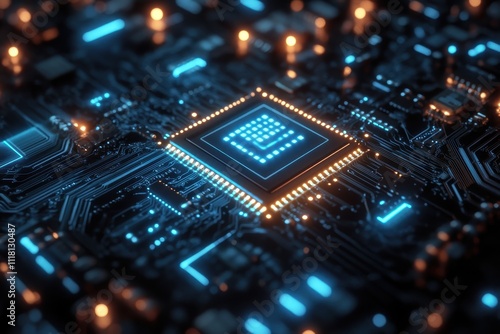 Obraz premium A high-tech image focusing on a glowing microchip centered on a complex...