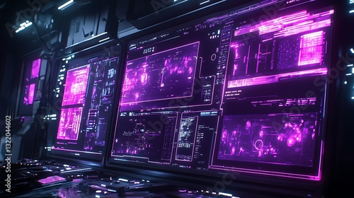 © tayyaba, Obraz premium A high-tech interface with multiple floating touchscreens and neon purple lines