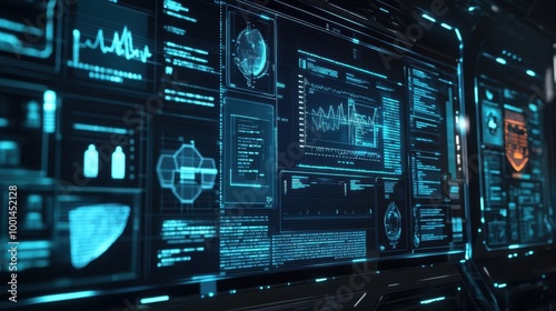 © 69 Timeless Studio , Obraz premium A high-tech medical interface displaying patient records electronically, representing the future of healthcare technology.
