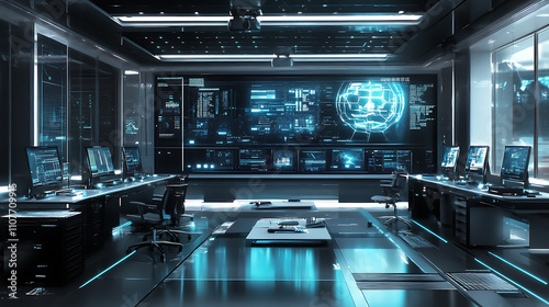Obraz premium A high-tech office with multiple screens and advanced equipment