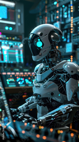 Fototapeta premium A high-tech robot with advanced machinery, illuminated by vibrant server room...