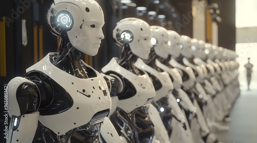 Fototapeta premium A high-tech robotics facility where humanoid robots are assembled and tested...