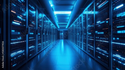 Fototapeta premium A high-tech server room glowing with blue LED lights and digital displays.