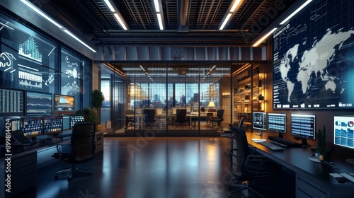 Fototapeta premium A high-tech trading workspace featuring a glass-walled office, multiple screens, and a modern design. The combination of advanced technology and sophisticated decor creates a professional environment