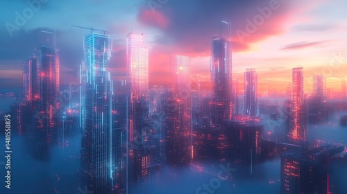 Naklejka premium A high-tech urban development area featuring floating holographic construction models