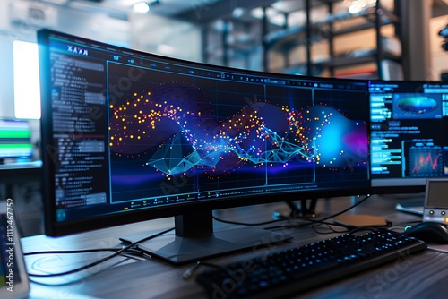 Fototapeta premium A high-tech workstation with a curved monitor showing a detailed neural...