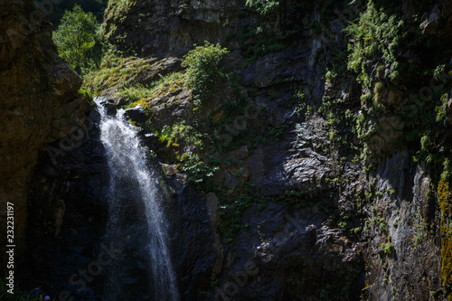 © Ольга Симонова, Fototapeta premium A high waterfall with white splashes of water descends from the mountain and sparkles in the sun. Attraction of Georgia Gveleti waterfall