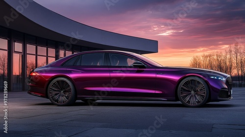 © Aleksandra, Fototapeta premium A highgloss luxury car in the color Future Dusk parked on an empty street at sunset The deep violet paint shines under the fading sunlight creating rich reflections and sleek curves The background sky