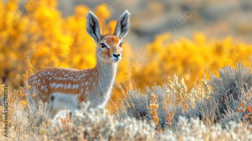 © Victuscon, Fototapeta premium A highly detailed close-up of a saiga antelope standing in a vast steppe, its unique bulbous nose and sandy-colored fur perfectly illuminated.