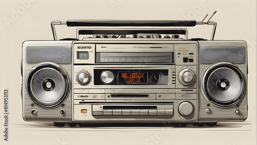 Fototapeta premium A highly detailed drawing of a classic boombox against a beige background,...