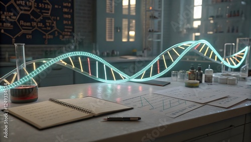 Fototapeta premium A highly detailed, glowing DNA strand floating over a lab table, ultra-clear...
