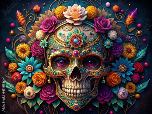 © Sandra, Naklejka premium A highly detailed, intricately designed sugar skull adorned with vibrant flowers, ornate swirls, and glittering gemstones, set against a dark, mysterious, and dramatic background.