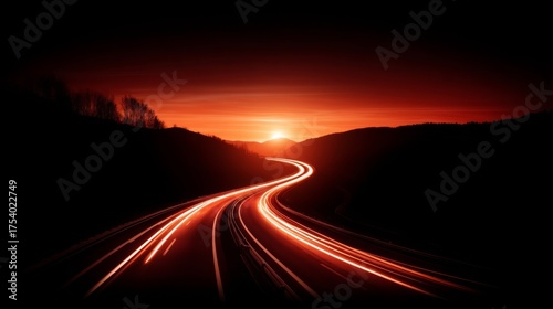 Fototapeta premium A highway illuminated by light trails from passing cars during a stunning sunset or sunrise,