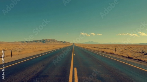 Fototapeta premium A highway stretching into the horizon with a vanishing point, surrounded by open fields or desert, emphasizing the sense of distance and travel.