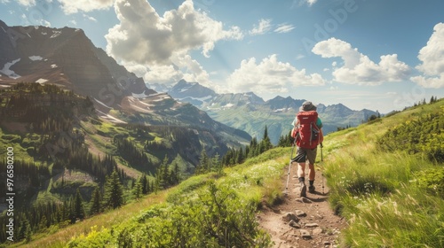 © Chanrothana Pech, Obraz premium A hiker enjoying a sunny summer day in the mountains with expansive views