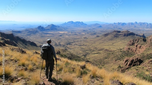 © elimicel, Obraz premium A hiker gazes over a vast mountainous landscape under a clear blue sky.
