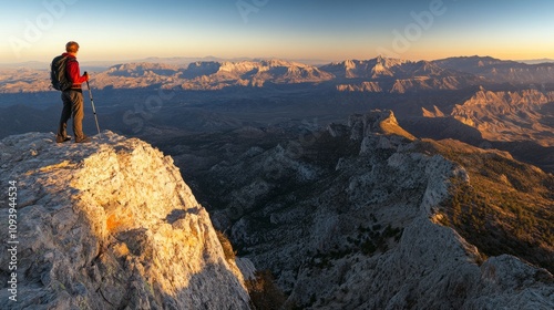 Fototapeta premium A hiker standing on the edge of a cliff, gazing out at vast mountain ranges stretching into the horizon, with golden hour sunlight casting long shadows across the rugged terrain