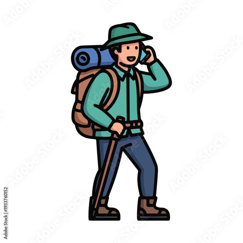 Fototapeta premium A hiker stands confidently with a walking stick, wearing a hat and backpack,...