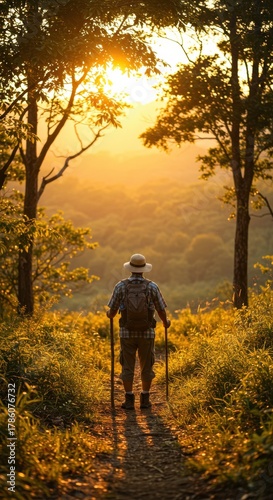 © Mauricio, Fototapeta premium A hiker walks along a trail in the forest at sunset, enjoying the golden light