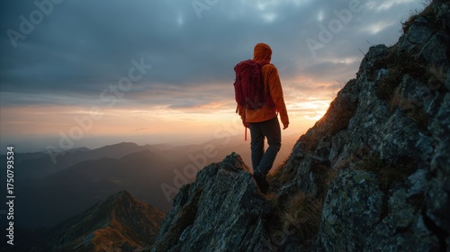 © mila103, Obraz premium A hiker with a red backpack navigates rocky terrain during sunset surrounded by mountains. The sky is filled with clouds creating a stunning view of natures beauty.