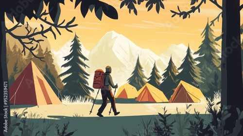 © Mohammed, Obraz premium A hiker with trekking poles walks through a campsite with colorful tents and towering pine trees set against a backdrop of snowy mountains.