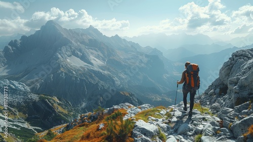 Obraz premium A hikers traversing a steep mountain pass, the rocky terrain and sweeping...