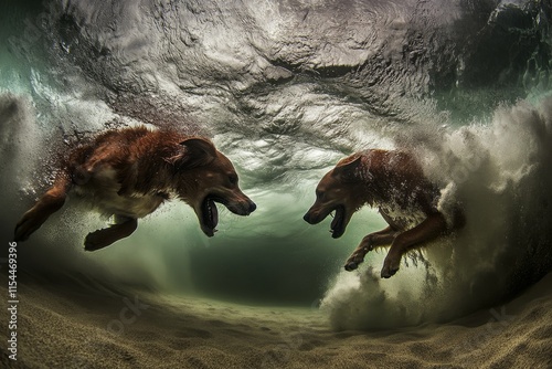 Obraz premium A hilarious underwater photo captures a golden labrador retriever puppy playing in a swimming pool, jumping and diving deep down. It shows action-filled training games with family pets and popular