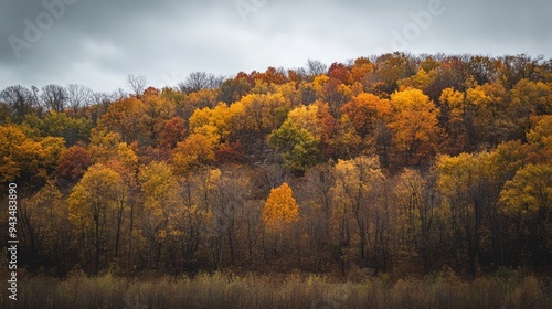 © Timeless Touch, Fototapeta premium A hillside covered in autumn trees, with the sky peeking through the branches.