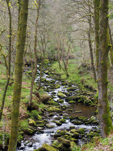 © Philip J Openshaw , Fototapeta premium a hillside stream running though moss covered rocks and boulders with surrounding early spring forest landscape in the colden valley in west yorkshire england