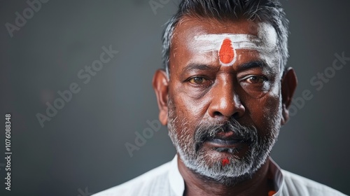 Fototapeta premium A Hindu priest showcases peaceful expression and traditional attire, with a tilak accentuating his forehead in soft natural lighting