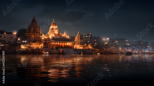 Fototapeta premium A hindu Vrindavan temple with beautiful lights and water generated by Ai