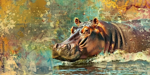 Fototapeta premium A hippopotamus emerges from water with abstract background.