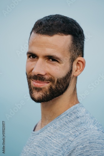 © Roman Tyukin, Fototapeta premium A Hispanic man with a beard near the sea in a highland park in Spain