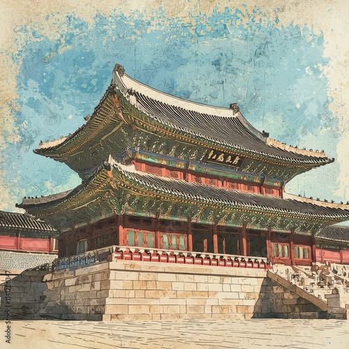 © KP, Obraz premium A historic Asian building with intricate architecture, featuring a tiered roof, vibrant colors, and surrounded by a serene landscape.