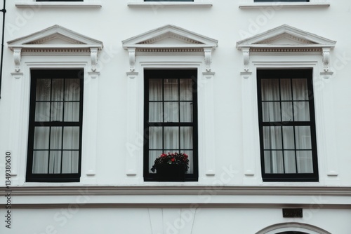 © gamespirit, Fototapeta premium A historic building showcases intricate architectural details and a lovely window planter, all set against the backdrop of an overcast urban day