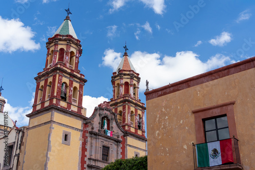 Obraz premium A historic building with two tall towers and a large window. The building is situated in a peaceful. Historic center of Queretaro, colonial architecture, decorations for the celebration of Mexico's In