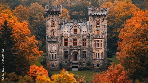 Naklejka premium A historic castle surrounded by autumn trees, cinematic look