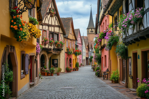 © Muhammad, Fototapeta premium A historic European town square lined with colorful buildings, cobblestone streets, and ornate balconies filled with flowers.