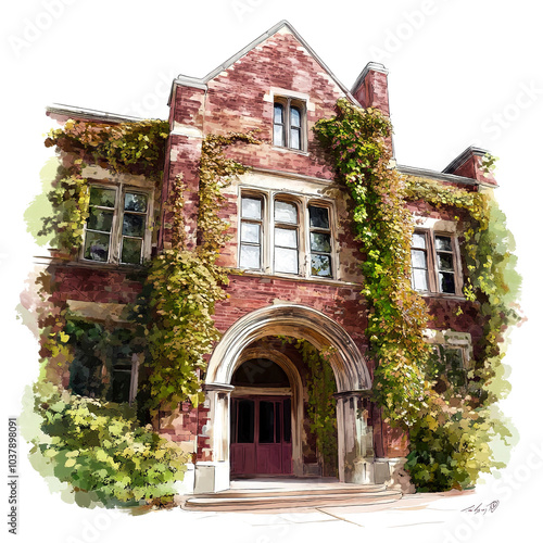 © Thanthara, Fototapeta premium A historic school building with ivy-covered walls and arched entrances, academic charm, digital painting, soft vintage hues, isolated on white background