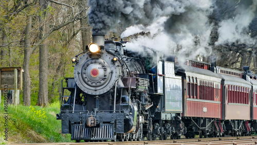 Naklejka premium A historic steam locomotive engine pulls vintage passenger cars along tracks surrounded by lush green trees. Thick black smoke billows from the engine as it moves through the countryside.