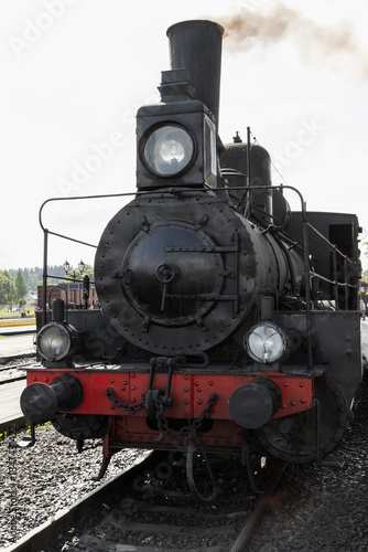© evannovostro, Fototapeta premium A historic steam locomotive faces the camera on a railway track