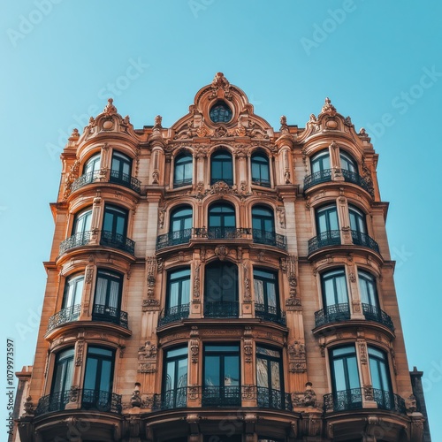 © Samady, Fototapeta premium A historical building with ornate architectural details, set against a clear blue sky