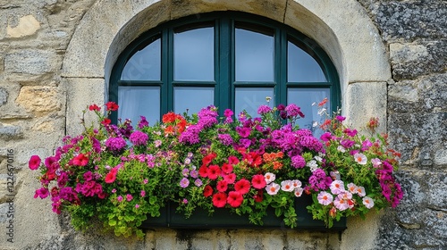 © Pannee, Naklejka premium A historical stone building with an arched window, overflowing with vibrant spring flowers in a peaceful village