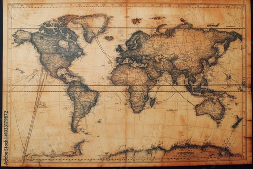 © Thanapong, Obraz premium A historical world map showing the trade routes and exploration paths of famous explorers, tracing the history of global connections and discoveries