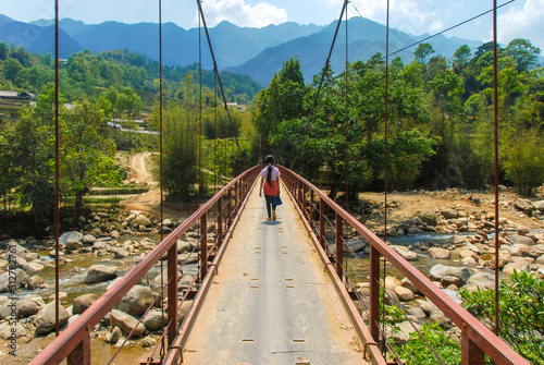 © Ilona, Fototapeta premium A Hmong girl walking on a bridge across stream in Sapa, Vietnam