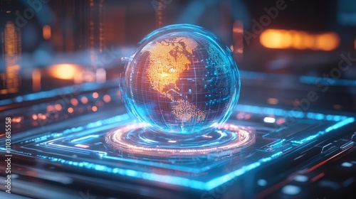 Fototapeta premium A holographic interface showing a spinning globe with data streams and analytics; hyper-realistic, bright neon blue, immersive design