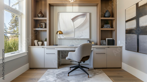 © Tahir, Fototapeta premium A home office with a built-in desk featuring hidden storage compartments. A comfortable ergonomic chair and modern artwork on the wall create a stylish and functional workspace