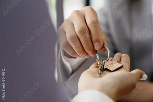 Fototapeta premium A home rental company employee is handing the house keys to a customer who...
